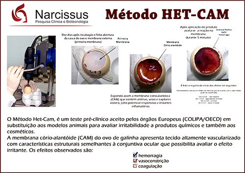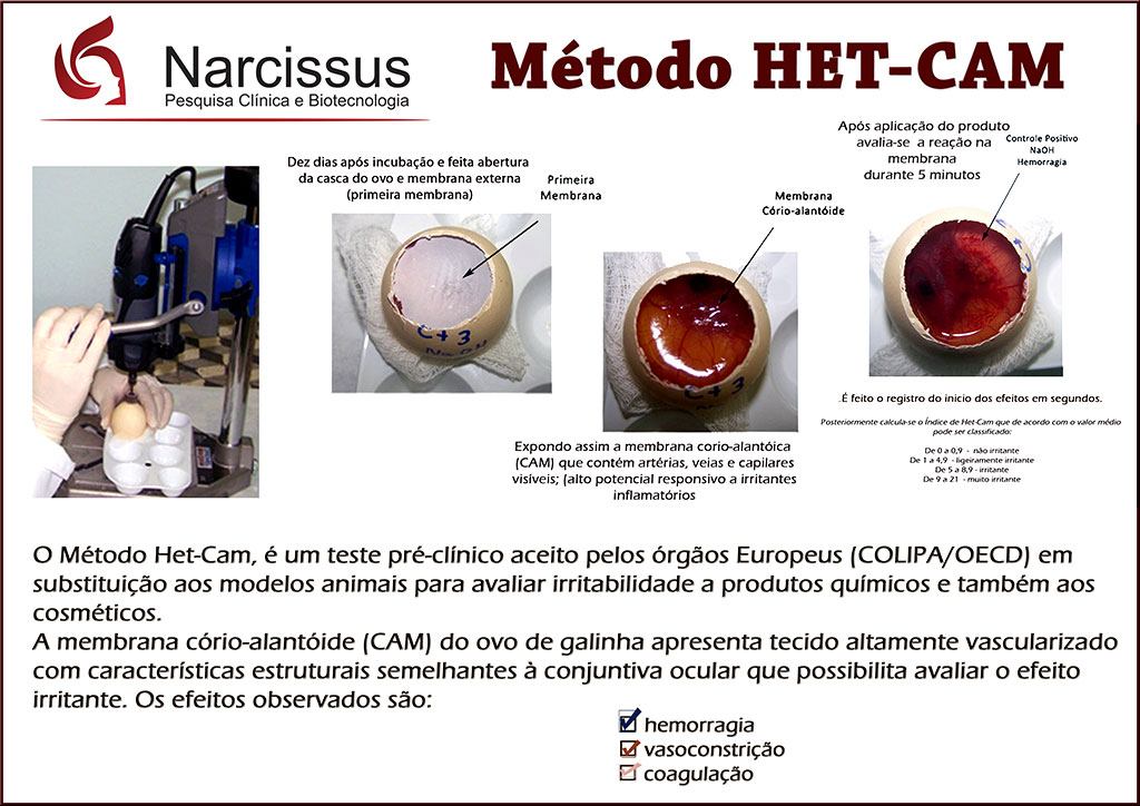 A membrana corioalantóide (MCA) do ovo de galinha é uma estrutura muito vascularizada, utilizada pelo embrião para trocas gasosas através da casca do ovo. Sua característica estrutural faz com que seja considerada similar aos tecidos altamente vascularizados como a conjuntiva, sendo capaz de responder frente a produtos irritantes. Estas características permitem que o método seja uma boa alternativa ao método clássico de Draize. O método utilizado corresponde a uma modificação do método descrito por Luepke (1985), para o ensaio do potencial irritante e corrosivo, permitindo o estudo dos efeitos imediatos das substâncias sólidas ou líquidas na membrana do ovo de galinha embrionado.